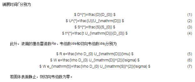 若一個具有初始球形當量直徑D0以及初始面積S0的液滴在撞擊過程中經過鋪展時間t后的鋪展直徑為D,鋪展面積為S,且此時鋪展線速度為U,則定義相應的無量綱鋪展因子D*、無量綱鋪展速度U*、無量綱鋪展面積S*和無量綱鋪展時間t*分別為