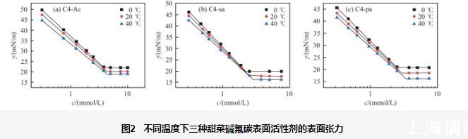 總體而言,溫度對(duì)甜菜堿氟碳表面活性劑的cmc影響較小。此外,在0~40℃的溫度范圍內(nèi),對(duì)比三種表面活性劑的表面活性參數(shù)可知,cmc值均小于4.45 mmol/L,γcmc均小于22.19 mN/m。親水端官能團(tuán)的不同對(duì)表面活性劑的性能具有一定的影響,當(dāng)溶液濃度足夠大時(shí),C4-Ac的表面張力相對(duì)較高,C4-sa和C4-pa具有較低的表面張力,后者略高于前者,并且C4-sa和C4-pa的cmc值低于C4-Ac。因?yàn)閺姆肿咏Y(jié)構(gòu)上來看,C4-Ac比C4-sa和C4-pa少一個(gè)有效碳,因此前者的疏水性要略弱于后二者,可以解釋表面張力和cmc的相對(duì)大小。