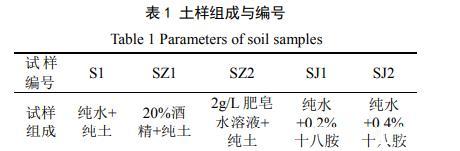試驗(yàn)用土取自云南省境內(nèi)昆曲高速公路嚴(yán)家山段,為淺灰色弱膨脹土,其自由膨脹率為55.7%,液限為41%,塑限為20.3%。取回的土樣經(jīng)過(guò)風(fēng)干、碾碎后過(guò)2 mm的篩備用。為研究氣–液界面張力對(duì)膨脹土干縮開(kāi)裂的影響,采用3種不同表面張力的液體作為土中的液相,分別為:純水、體積百分?jǐn)?shù)為20%的酒精溶液和含量為2 g/L的肥皂水;通過(guò)在土體中混合斥水劑的方法配制不同接觸角的土樣,斥水劑十八烷基伯胺(C18H39N),簡(jiǎn)稱:十八胺,為堿性白色蠟狀粉末,純度為99%,配制兩種斥水土樣,十八胺含量分別為:0.2%和0.4%。各土樣的成分和編號(hào)如表1所示。