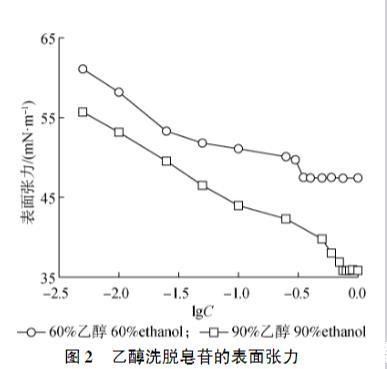 60%乙醇溶液洗脫得到皂苷的得率為39.03%,90%乙醇溶液洗脫得到皂苷的得率為5.01%。由圖2可知,60%乙醇溶液洗脫得到的皂苷臨界膠束濃度為0.35 g/L,最低表面張力為47.43 mN/m;而90%乙醇溶液洗脫得到的皂苷臨界膠束濃度為0.75 g/L,最低表面張力為35.83 mN/m。可以看出,90%乙醇洗脫得到的皂苷臨界膠束濃度更高,最低表面張力更低。說明苷元含量越高,其臨界膠束濃度越大,最低表面張力越小。