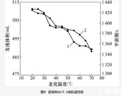 將起泡劑溶液在一定溫度下老化一定時間后,測試其發泡體積和泡沫半衰期的變化以評價其抗溫性能。稱取0.2 g起泡劑ULT-1于攪拌杯中,加入100 mL蒸餾水,置于攪拌器之上,以轉速11 000 r/min攪拌1 min。裝入老化罐,放入滾子加熱爐,在一定溫度下滾動16 h,取出冷卻至室溫,以轉速11 000 r/min攪拌1 min,測量發泡體積和半衰期。通過改變老化溫度測量起泡性能與老化溫度的關系,結果如圖9所示。從圖9可知:0.2%的新型起泡劑溶液在一定溫度范圍內(20~70℃),隨著老化溫度的升高起泡性能基本不變,表明研制的新型起泡劑ULT-1具有較好的抗溫性能。