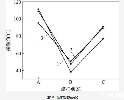煤樣潤濕性變化主要反映了起泡劑在煤樣表面的吸附與脫附情況,可以根據接觸角θ判斷潤濕性情況。通常把θ=90°作為是否潤濕的界限,θ>90°表明不潤濕,θ<90°表明潤濕,θ越小,潤濕性能越好。分別取滇東黔西地區的松河15號煤樣、恩洪16號煤樣和天井8號煤樣,利用接觸角/表面張力測量儀通過五點擬合法分別測量純水在原始煤樣(A狀態)、0.2%起泡劑ULT-1溶液浸泡1 h烘干的煤樣(B狀態)、0.2%起泡劑ULT-1溶液浸泡1 h后低速水流沖洗1 h烘干的煤樣(C狀態)表面的接觸角,結果如圖10所示。將C狀態接觸角與B狀態接觸角的差值定義為接觸角增加值,C狀態接觸角與A狀態接觸角的比值定義為潤濕性恢復值,間接反映了新型起泡劑ULT-1在煤樣表面的脫附程度,潤濕性恢復值越大,越易脫附,脫附程度越大。原始煤樣接觸角均大于90°,為水不潤濕(A狀態),起泡劑ULT-1在煤樣表面吸附后接觸角均小于90°,將煤樣表面變為中度潤濕(B狀態),但是低速水流沖洗吸附了起泡劑ULT-1的煤樣1 h后,接觸角均明顯增大,松河15號與天井8號煤樣的接觸角增加38°以上,接近90°,變為弱潤濕(C狀態),恩洪16號煤樣的接觸角增加43°以上,超過90°,變為不潤濕(C狀態)。各煤樣潤濕性恢復值均超過69%,天井8號潤濕性恢復值最高達到93.70%,表明新型起泡劑ULT-1在煤層氣排液開采過程中易于脫附,有利于儲層保護。