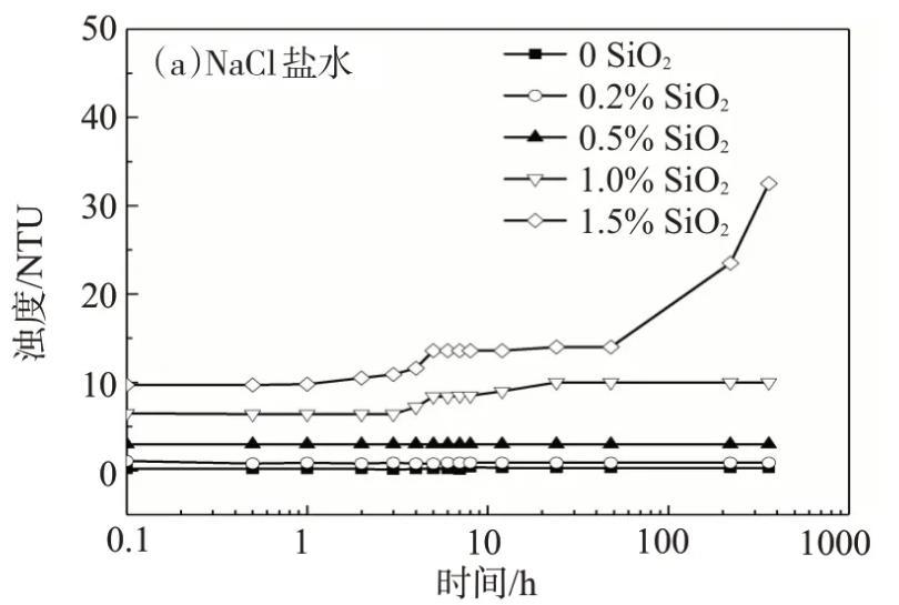 用模擬地層水配制的納米SiO2/SDS體系經(jīng)歷了澄清透明-渾濁-沉降的3個(gè)階段,靜置初始,納米SiO2質(zhì)量分?jǐn)?shù)為0.5%的體系的濁度不隨時(shí)間的延長(zhǎng)而變化,表明此時(shí)體系穩(wěn)定;靜置1 h后,濁度明顯增加;靜置6 h后,體系的濁度又恢復(fù)到了初始值,由于實(shí)驗(yàn)測(cè)試的是樣品上半部分的濁度,說明此時(shí)體系已經(jīng)完全沉降。