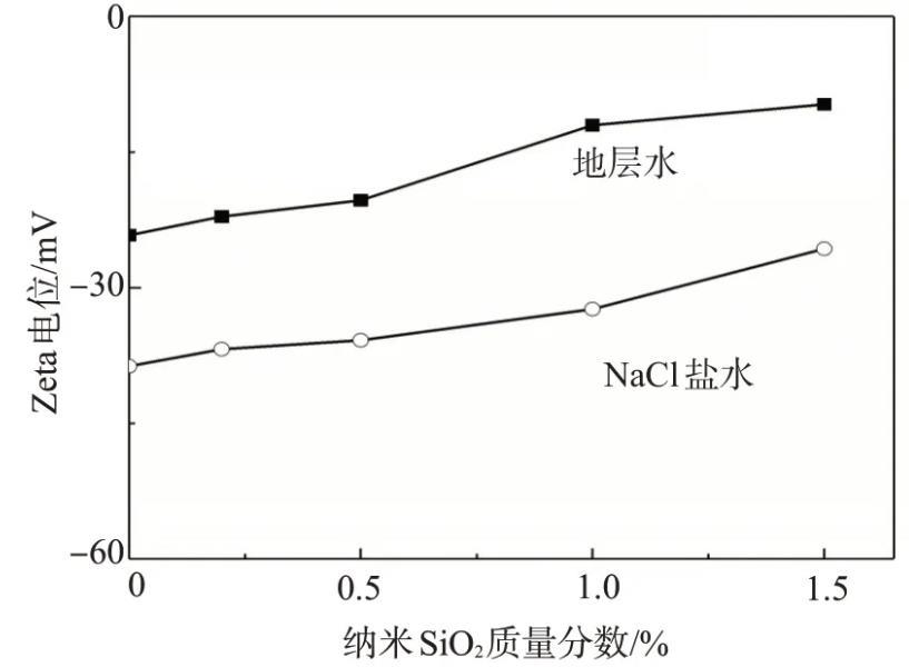 圖2給出了分別用模擬地層水和NaCl鹽水配制的不同納米SiO2含量的納米SiO2/SDS體系的Zeta電位。當(dāng)納米SiO2的質(zhì)量分?jǐn)?shù)分別為0.2%、0.5%和1.0%時(shí),用NaCl鹽水配制的納米SiO2/SDS體系的|ζ|均大于30 mV,因而表現(xiàn)出較好的穩(wěn)定性;而當(dāng)納米SiO2質(zhì)量分?jǐn)?shù)為1.5%時(shí),體系的|ζ|略低于30 mV,因此納米SiO2/SDS體系在靜置15 d后才出現(xiàn)輕微的混濁。用模擬地層水配制的納米SiO2/SDS體系的|ζ|均明顯小于30 mV,說明體系的穩(wěn)定性差,靜置幾小時(shí)即出現(xiàn)了渾濁和沉淀。納米SiO2帶負(fù)電,金屬陽(yáng)離子Ca2+,Mg2+和Na+等的存在會(huì)壓縮納米SiO2的雙電層,由于Ca2+,Mg2+離子的價(jià)數(shù)高,壓縮雙電層的能力強(qiáng),導(dǎo)致體系的|ζ|降低,穩(wěn)定性變差,由此可見,要使納米SiO2/SDS分散體系具有良好的穩(wěn)定性,應(yīng)減少體系中二價(jià)Ca2+、Mg2+的含量。