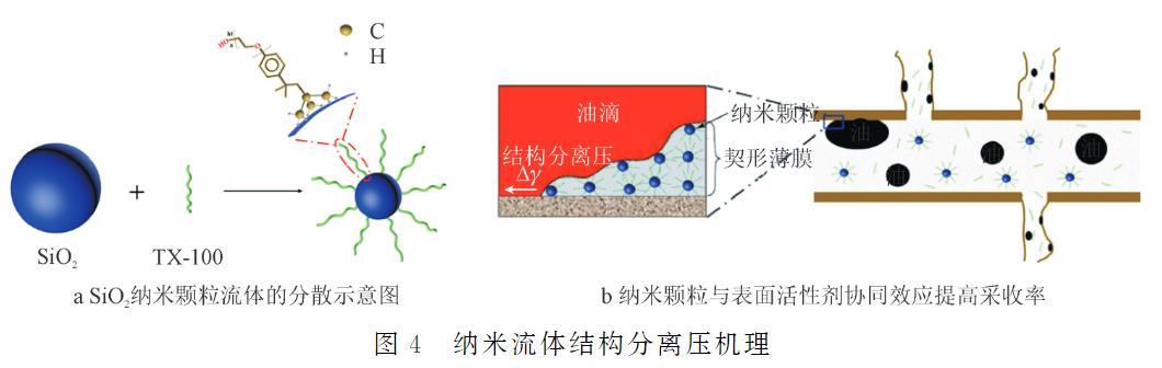 WasanD等提出的“結(jié)構(gòu)分離壓”理論,解釋了納米流體在油-固界面時這種壓力作用將油膜或油滴從巖石表面分離的過程。通過進(jìn)一步的研究發(fā)現(xiàn),這種結(jié)構(gòu)分離壓力的大小和速度受到納米顆粒濃度和液滴體積的影響。ZHAO等以非離子表面活性劑(TX-100)作為分散劑和增效劑,將SiO2納米顆粒分散在水中形成SiO2納米流體(如圖4a所示),并對SiO2納米流體剝離固體表面油滴的能力進(jìn)行了探究。SiO2納米流體和表面活性劑(TX-100)均具有將油滴從巖石表面脫離的能力。與表面活性劑(TX-100)相比,當(dāng)添加SiO2納米顆粒時,納米流體可以在油/固體/納米流體三相接觸區(qū)形成薄膜從而產(chǎn)生結(jié)構(gòu)分離壓,將油滴從巖石表面剝離。由于表面活性劑天然剝離油滴的能力和SiO2納米顆粒的結(jié)構(gòu)分離壓力機理(如圖4b所示),SiO2納米流體具有優(yōu)秀的滲吸提高采收率能力。