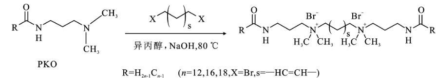 根據前期的工作[2-4]。在圓底燒瓶中,先將0.1 mol連接基化合物,反-1,4-二溴-2-丁烯溶于100 mL異丙醇中。將0.2 mol脂肪酸酰胺丙基二甲胺(PKO-12、PKO-16、PKO-18)加入反應溶液中,并以氫氧化鈉0.4 g作為催化劑加速反應,在80℃下攪拌12 h。反應結束后,用真空蒸發去除溶劑,得到蠟狀的粗產物。將得到的蠟狀粗品固體在乙酸乙酯/乙醇(20∶1)混合溶劑中重結晶3次,得到白色粉末狀陽離子Gemini表面活性劑。所制備的Gemini表面活性劑(GS-12,GS-16,GS-18)的產率分別為93.5%,92.4%,94.1%。Gemini表面活性劑GS-12,GS-16,GS-18的合成路線如下: