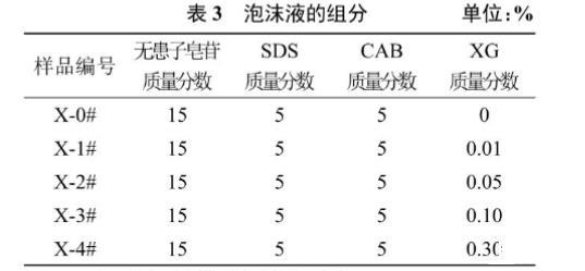 表3為泡沫溶液的配方。根據(jù)三元復(fù)配體系的發(fā)泡性能,選取發(fā)泡性能最佳的9號組,無患子皂苷、SDS、CAB質(zhì)量分數(shù)固定在15%、5%、5%。研究XG濃度變化對泡沫溶液性能的影響。