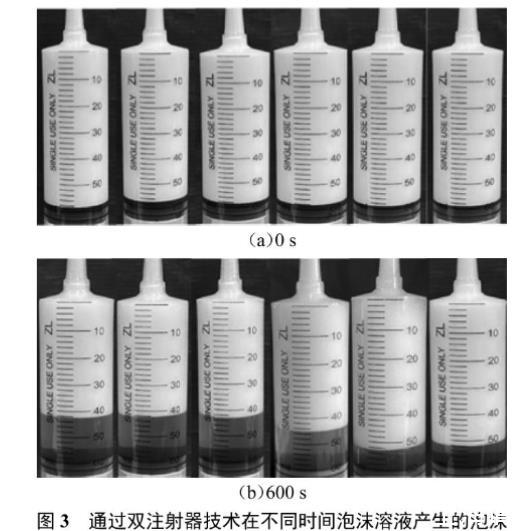 圖3通過雙注射器技術(shù)在不同時間泡沫溶液產(chǎn)生的泡沫