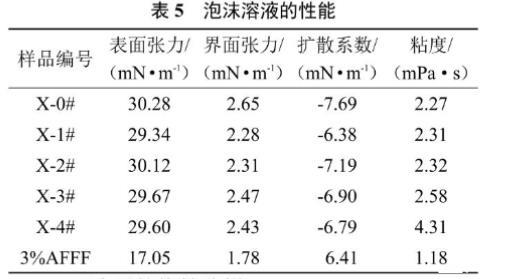 測得環(huán)己烷的表面張力為25.24 mN/m,根據(jù)式(1),6組試驗組其擴散系數(shù)如表5所示。X-0#、X-1#、X-2#、X-3#和X-4#樣品擴散系數(shù)都為負值。試劑復(fù)配后活性劑分子疏水基水分子之間依然有較大斥力,因此,此配方所產(chǎn)生的泡沫無法在油面上形成水膜[11]。X-0#、X-1#、X-2#、X-3#和X-4#樣品之間的表面張力和界面張力表現(xiàn)出較小的差異,分別在29.60~30.28 mN/m和2.31~2.65 mN/m之間。表明XG對泡沫溶液的表面張力和界面張力影響較小,影響表面張力和界面張力的主要原因是表面活性劑的種類。X-4#樣品的粘度變化比較明顯,因為XG濃度的增加導(dǎo)致聚合物網(wǎng)絡(luò)結(jié)構(gòu)的增強,并且XG與表面活性劑相互作用:通過靜電、疏水和氫鍵等發(fā)生,這有助于顯著增加溶液粘度的協(xié)同效應(yīng)。