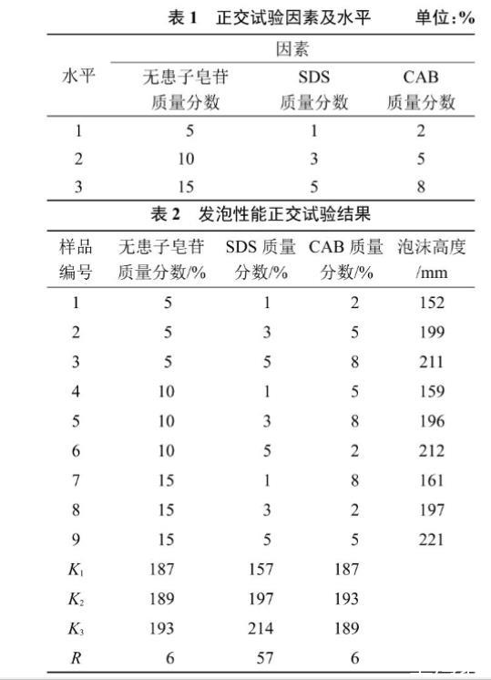 根據(jù)正交表測定其發(fā)泡高度,結(jié)果見表2。表2中K1、K2、K3表示各因素在相應(yīng)水平下評價指標的平均值,R為各因素相應(yīng)水平下評價指標的級差。發(fā)泡高度的極差R值表明,各因素的重要性依次為SDS>CAB=無患子皂苷,SDS對復(fù)配體系的發(fā)泡性能影響最大。由表2中發(fā)泡高度的K值可見,發(fā)泡性能最佳的組合是第9組。表面活性劑復(fù)配后隨著其添加量的增加,空氣與液膜之間的活性劑分子濃度增加,有利于提高泡沫溶液的發(fā)泡能力[9]。