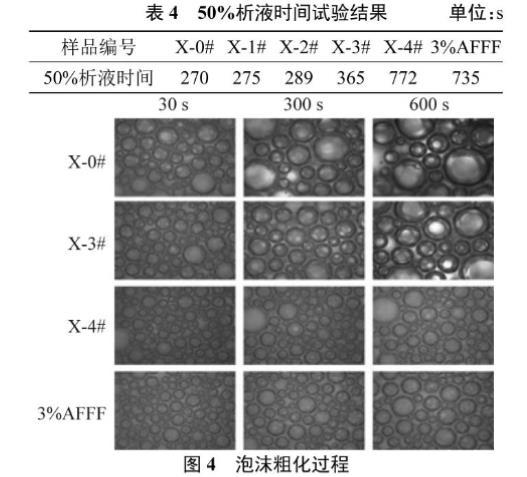 X-1#、X-2#與X-0#樣品的50%析液時間相近,表明質(zhì)量分數(shù)0.01%的XG和質(zhì)量分數(shù)0.05%的XG對穩(wěn)定泡沫無明顯作用。為簡潔起見,僅顯示X-0#、X-3#、X-4#和3%AFFF泡沫形態(tài)隨時間的變化見圖4。在形成均質(zhì)泡沫后30 s時,4種泡沫溶液產(chǎn)生的泡沫尺寸大部分為幾十微米,大的不超過200m。之后由于泡沫之間的壓差,導(dǎo)致泡沫不斷粗化、聚并,在泡沫粗化過程中,各組泡沫形態(tài)發(fā)生變化。X-0#和X-3#的泡沫在600 s時,泡沫數(shù)量明顯減少,X-0#最大泡沫尺寸達到239m,添加質(zhì)量分數(shù)0.1%的XG的X-3#泡沫量也減少,但泡沫粗化現(xiàn)象減弱,XG加入質(zhì)量分數(shù)0.3%的X-4#樣品泡沫尺寸變化小,最大泡沫尺寸為164m,可見添加XG對泡沫的粗化有明顯的抑制作用。添加質(zhì)量分數(shù)0.3%XG泡沫與3%AFFF有相似的泡沫粗化過程。