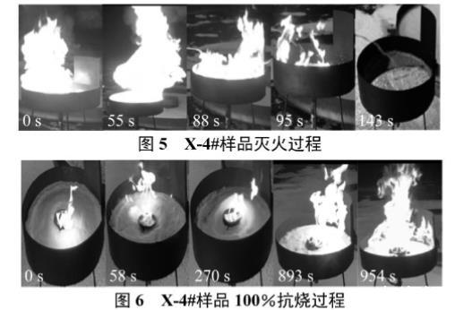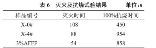 X-4#樣品泡沫具有高泡沫穩(wěn)定性,在以下研究中,著重研究X-4#與X-0#、3%AFFF相比的滅火及抗燒性能,測(cè)得的滅火時(shí)間及100%抗燒時(shí)間見(jiàn)表6。根據(jù)GB 15308—2006規(guī)定,滅火時(shí)間小于180 s,抗燒時(shí)間高于600s的泡沫被認(rèn)為具有成為消防泡沫滅火劑的潛力,X-4#樣品滅火時(shí)間88s、抗燒時(shí)間954 s,抗燒時(shí)間優(yōu)于3%AFFF,滅火時(shí)間比3%AFFF略高,但滿(mǎn)足消防用泡沫滅火劑性能要求,具有良好的消防滅火應(yīng)用潛力。