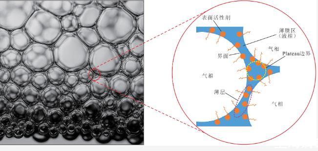 泡沫是一種熱力學(xué)不穩(wěn)定的膠體體系,其中氣體分散在表面活性劑穩(wěn)定的連續(xù)液相中,可以自發(fā)破裂。圖1顯示由表面活性劑形成的典型泡沫結(jié)構(gòu)。提高CO2泡沫的穩(wěn)定性具有挑戰(zhàn)性,因?yàn)樵诟邏簝?chǔ)層條件下,CO2更易溶于水,溶解的CO2會(huì)引起泡沫的團(tuán)聚。