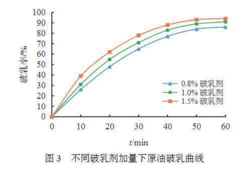 將單相酸與原油高速攪拌混合制備乳狀液,油水比3∶2。分別加入0.8%、1.0%、1.5%二酸二辛脂磺酸鈉破乳劑,水浴90℃,靜態放置,每隔10 min測量析出量,計算破乳率,實驗結果見圖3。加入1%破乳劑后,單相酸破乳率在1 h內可達到90%以上。