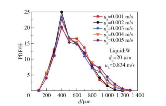 在表觀氣速ug=0.1-0.3 m/s范圍內(nèi),表面張力對(duì)氣泡尺寸的調(diào)控作用呈現(xiàn)非線性特征。當(dāng)ug>0.2 m/s時(shí),高表觀氣速引發(fā)的慣性力(Fg=πd2ρgug/4)增強(qiáng),部分抵消了低σ?guī)淼某叽鐪p小效應(yīng)。實(shí)驗(yàn)數(shù)據(jù)顯示,在ug=0.3 m/s條件下,σ從72降至49 mN/m僅使dav減少18%,較ug=0.1 m/s時(shí)的32%減幅顯著降低。