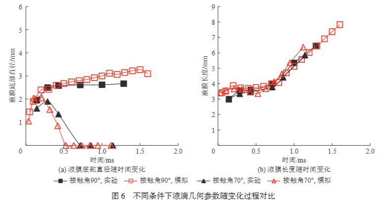 為進一步驗證本模型計算結果的可靠性,依據BANITABAEI等在實驗中設置的不同碰撞條件,開展了相應的數值模擬。如圖5b和圖5c所示,在不同碰撞條件下,數值模擬結果中的液滴形變過程與實驗結果均具有較高的吻合度。圖6對比了數值模擬結果與實驗結果中液滴幾何尺寸的變化過程,也具有較高的吻合度。其中,圖6a所展示的液膜底部直徑隨時間變化曲線,數值模擬結果與實驗結果稍有偏差,原因是實驗中固定顆粒的支撐柱對液膜底部的形變過程產生了一定影響。綜上所述,可認為筆者構建的數值模擬模型合理,結果具有較高可靠性。由于在毫米尺度下和微米尺度下,液滴與固體顆粒的碰撞過程均遵守經典牛頓力學定律和經典流體力學理論,所以本數值模擬模型可用于微米尺度下的其他工況條件的數值模擬研究。