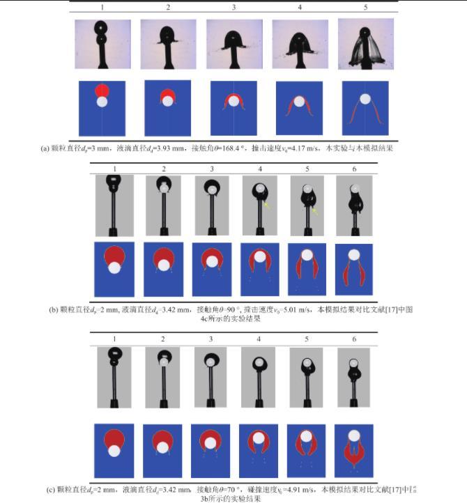 為了進行網格尺寸獨立性分析,在計算域尺寸為21 mm×66 mm時,將網格尺寸分別設置為0.06、0.03、0.018和0.014 mm。在實驗中的碰撞條件為顆粒直徑dp=3 mm,液滴直徑dd=3.93 mm,接觸角θ=168.4°,撞擊速度v0=4.17 m/s。在上述相同碰撞條件下,利用不同網格尺寸開展數值模擬,并測量不同時刻下液膜長度和液膜底部直徑的變化數據進行對比,如圖3所示。如圖4所示,隨著網格尺寸降低,數值模擬結果與實驗結果趨于重合。當21 mm×66 mm計算域的網格尺寸達到0.014 mm時,數值模擬結果與實驗結果之間的偏差低于5%,圖5a對比了網格尺寸為0.014 mm時模擬得出的液滴形態與實驗中拍攝的液滴形態,兩者具有較高的吻合度。故后續模擬中均按此比例生成計算域網格。
