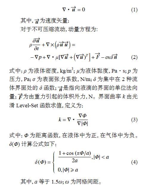 由于通過實驗觀測微米尺度的液滴?顆粒碰撞過程十分困難,故主要采用數值模擬方法開展相關研究。為求解多相流的界面形變問題,前人曾采用過Lattice-Boltzmann、Level-Set、VOF、CLSVOF等模型。由于前人研究案例中CLSVOF模型對液滴形態的模擬結果能與實驗結果高度吻合,筆者采用此模型對塵?霧碰撞過程進行模擬。