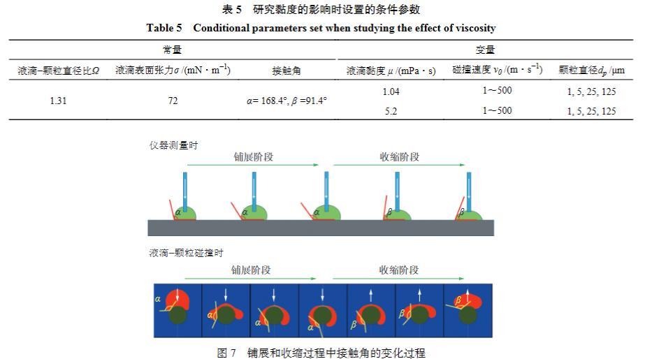 由于碰撞速度、粒徑和液滴黏度均會對液滴與顆粒的碰撞行為產生明顯影響,筆者針對這幾個因素設置了不同的數值模擬工況。具體工況參數見表5所示,其中液滴鋪展過程中的前進接觸角為α;液滴收縮過程中的后退接觸角為β。利用數值模擬軟件的自動保存功能,對碰撞行為發展過程中不同時刻的模擬數據進行了保存。如圖7所示,當液滴在顆粒表面鋪展時,在迭代過程中將接觸角值設置為α。在液滴在顆粒表面的鋪展過程轉變為收縮過程的時刻,將接觸角數值由α改為β,再進行后續的迭代計算。