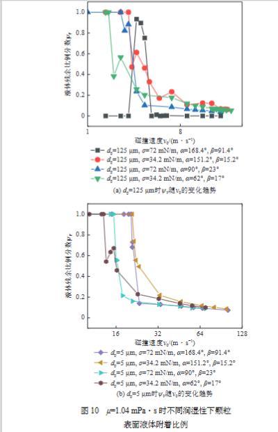 總結(jié)了霧滴—塵粒碰撞過程會(huì)發(fā)生的“反彈”、“完整聚并”、“包裹后撕裂”、“膜狀飛濺”4種行為類型,并發(fā)現(xiàn)碰撞后顆粒表面的液體附著比例變化曲線的轉(zhuǎn)折點(diǎn)與相應(yīng)的碰撞行為密切相關(guān)。
