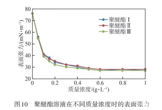 在室溫下,將聚醚酯配制成不同質(zhì)量濃度的水溶液,測(cè)試其表面張力,結(jié)果見(jiàn)圖10。由圖10可知,聚醚酯溶液的表面張力隨其質(zhì)量濃度的增高而下降,當(dāng)聚醚酯溶液的質(zhì)量濃度為0~0.2 g/L時(shí),聚醚酯溶液的表面張力下降較快,當(dāng)聚醚酯溶液的質(zhì)量濃度大于0.2 g/L時(shí),聚醚酯溶液的表面張力隨其質(zhì)量濃度的增加而下降較慢,3種官能度聚醚酯的表面張力下降趨勢(shì)基本一致,當(dāng)聚醚酯溶液的質(zhì)量濃度提高到0.6 g/L時(shí),3種聚醚酯溶液的表面張力均降至27.0 mN/m,說(shuō)明聚醚酯在較低的質(zhì)量濃度下可以快速降低表面張力,表面性能優(yōu)異。