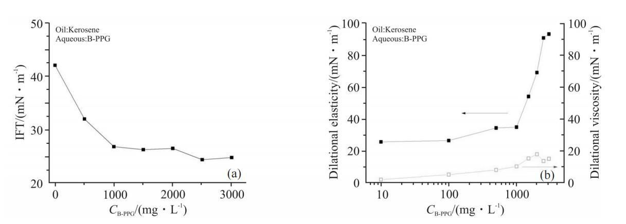 B-PPG是部分支化、部分交聯(lián)的聚丙烯酰胺,其分子結構中既含有親水基團丙烯酰胺,又含有疏水的烷基鏈,是一種高分子量的界面活性物質,能夠在油水界面上自發(fā)地吸附成膜,降低界面張力。Fig.2為B-PPG濃度對煤油-水界面張力和界面擴張流變參數(shù)的影響。由Fig.2(a)可知,B-PPG溶液具有一定的界面活性,隨著其濃度增大,界面張力逐漸降低,濃度高于1000mg/L后,達到平臺值,約為25為mN/m。由Fig.2(b)可以看出,濃度低于1000mg/L時,B-PPG形成的界面膜強度較低,擴張彈性和擴張黏性隨濃度緩慢增大。擴張彈性從約25mN/m升高到35mN/m,擴張黏性從約1mN/m升高到10mN/m;當B-PPG濃度大于1000mg/L時,隨著濃度的增大,界面膜的擴張彈性顯著升高,濃度達到2000mg/L時,擴張彈性高達90mN/m;而擴張黏性變化不大,僅上升到約20mN/m。