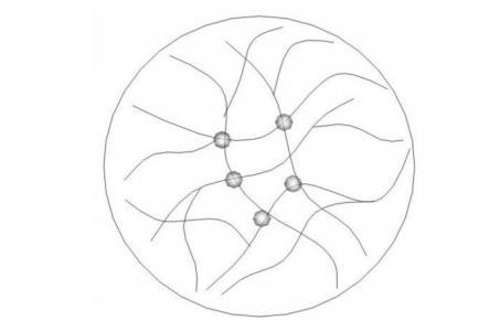 聚合物驅是油田開發(fā)穩(wěn)產增產最重要的技術手段之一,在國內外油田得到了廣泛的應用。但聚驅后油藏儲層非均質性加劇,剩余油分布更加分散,常規(guī)方法已經無法滿足生產實踐的需要。近年來,改性聚丙烯酰胺已成為研究熱點,其中黏彈性顆粒驅油劑(B-PPG)由于其獨特的性能更是得以快速發(fā)展。B-PPG是通過多官能團引發(fā)合成的高分子支化鏈與三維交聯(lián)網絡結構共存的聚丙烯酰胺,其分子結構示意圖如Fig.1所示。這種“軟固體”凝膠顆粒以固體顆粒的形式懸浮于溶液中,具有較好的變形能力,運移過程中時堵時驅,可以有效調節(jié)地層的非均質性。同時,其又具有較好的耐溫抗鹽、耐老化能力。目前,B-PPG驅油劑已經在勝利油田、河南油田推廣應用,增油降水效果明顯。