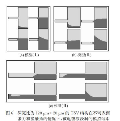 模型(I)使用的表面張力和接觸角為不含活性劑的TSV標(biāo)準(zhǔn)鍍液的實(shí)際測(cè)量值,仿真結(jié)果是不能完全浸潤(rùn);模型(II)采用的是在1L TSV標(biāo)準(zhǔn)鍍液中加入20mL活性劑溶液的實(shí)際測(cè)量值,這兩種模型在仿真中均表現(xiàn)為不能完全浸潤(rùn)。