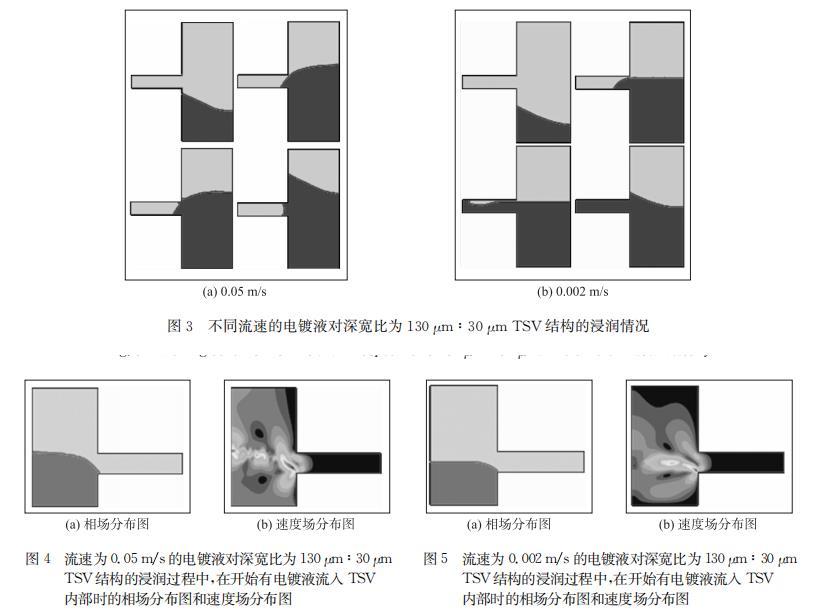 TSV深寬比設(shè)置為130μm:30μm,電鍍液流人速度為0.05 m/s和0.002 m/s的浸潤(rùn)仿真結(jié)果分別如圖3所示,前者在TSV底部形成氣泡,后者可以完全浸潤(rùn)。模擬結(jié)果表明降低電鍍液流入速度有利于浸潤(rùn)。通過(guò)仿真中兩種情況下浸潤(rùn)過(guò)程中的流速場(chǎng)對(duì)比,可以看出在電鍍液流入的過(guò)程中,電鍍液流人速度較大時(shí),如圖4(b)所示,電鍍液表面距離TSV較遠(yuǎn)的部分有著相對(duì)更大的流速,即電鍍液流過(guò)TSV上方的速度大于電鍍液向TSV內(nèi)部流入的速度,導(dǎo)致在電鍍液流過(guò)TSV上方時(shí),其流入TSV內(nèi)部的分流量還沒(méi)有充滿(mǎn)TSV內(nèi)部排出其中氣體之前,電鍍液就已經(jīng)流過(guò)了TSV上方,并將TSV口部封死,導(dǎo)致內(nèi)部殘留氣體無(wú)法排出,形成不完全浸潤(rùn);而當(dāng)電鍍液流入速度較小時(shí),如圖5(b)所示,電鍍液表面在TSV口部附近具有相對(duì)更大的流速,即電鍍液向TSV內(nèi)部流入的速度大于其流過(guò)TSV上方的速度,使得電鍍液流過(guò)TSV上方時(shí),有足夠的分流量流入TSV內(nèi)部,將其中氣體排出并將TSV填滿(mǎn),實(shí)現(xiàn)完全的浸潤(rùn)。