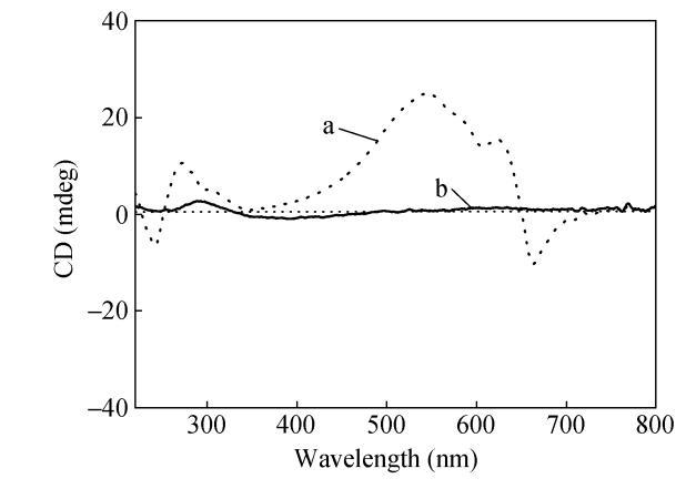 香豆素基團在紫外光照條件下可發生可逆的光二聚反應:在365nm光輻照下,香豆素基團能發生光二聚反應,在254nm輻照下香豆素二聚體能可逆地發生解二聚反應。可以預見香豆素端基的二聚化將影響香豆素取代二乙炔單體在氣液界面的組裝,從而影響聚二乙炔主鏈螺旋結構的形成。我們用365nm紫外燈輻照CODA氯仿溶液20min,此時香豆素端基能發生二聚,而二乙炔基團不會發生聚合。將得到的CODA二聚體的氯仿溶液鋪展在水面上,沉積制備LB膜,制備得到的CODA二聚體LB膜能聚合成藍相。CD光譜測試發現香豆素基團和相應的聚二乙炔吸收帶均出現了明顯的CD信號,但強度較CODA LB膜均有所減弱,如圖8所示。