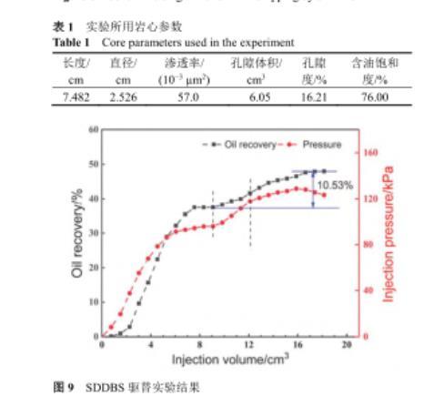結(jié)合上述研究,選取0.02%(w)SDDBS溶液作為驅(qū)油劑進(jìn)行巖心動態(tài)驅(qū)替實(shí)驗(yàn).本實(shí)驗(yàn)使用的巖心參數(shù)如表1所示.驅(qū)替實(shí)驗(yàn)共分為三個過程:模擬地層水驅(qū)、表面活性劑驅(qū)、后續(xù)模擬地層水驅(qū).驅(qū)替結(jié)果如圖9所示,初期地層水驅(qū),當(dāng)采出液含水率>98%時,計算采收率為37.36%.當(dāng)注入3.025 cm3 SDDBS溶液后采收率提高至41.67%,注入壓力升高.恒溫保持12 h后進(jìn)行后續(xù)水驅(qū),注入壓力逐漸升高,且當(dāng)采出液含水率>98%時,計算采收率為47.89%.說明SDDBS溶液驅(qū)在水驅(qū)基礎(chǔ)上提高采收率10.53%,具有優(yōu)異的驅(qū)油效果.
