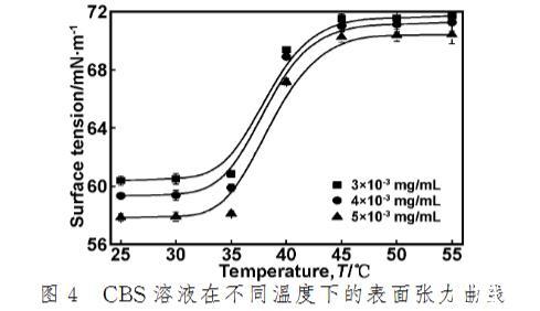 (3)CBS溶液的表面張力隨溫度的升高呈現(xiàn)兩種狀態(tài)。在低溫下,保持較好的表面活性,當溫度升高到一定程度(>35℃),由于變性作用,使得CBS的表面張力急劇增大。