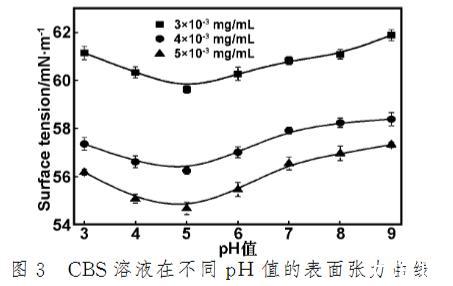 (2)CBS溶液的表面張力隨pH的增大呈現(xiàn)先降低而后增加的趨勢,在等電點附近表面張力最小。