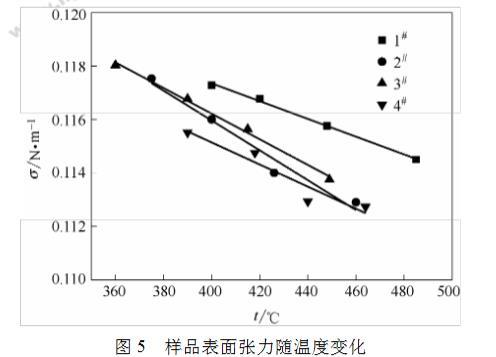 由測量結果知,1#混合溴化鹽在400~490°C的溫度范圍內,表面張力值在0.1173~0.1143 N·m?1