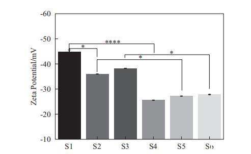在我們的研究中,測(cè)量了Zeta電位,如圖6所示。對(duì)于SLES體系(S1-S3),S1表現(xiàn)出最負(fù)的Zeta電位,其次是S3,而S2的Zeta電位最小。對(duì)于SMCT體系(S4-S6),它們之間的Zeta電位沒有顯著差異。比較SLES和SMCT體系時(shí),可以觀察到SMCT體系的Zeta電位低于SLES體系。此外,在S1和S4、S2和S5以及S3和S6之間發(fā)現(xiàn)了顯著差異。