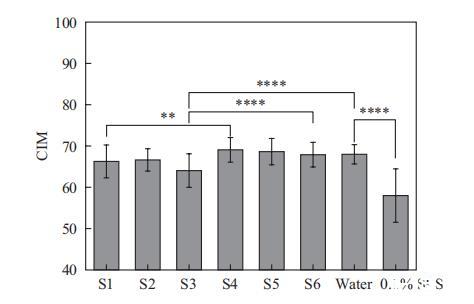 這里我們使用這種方法評(píng)估了6種表面活性劑復(fù)合物的溫和性。如圖5所示,SMCT體系(S4-S6)的CIM值與水的CIM值相當(dāng),并且顯著高于SLES體系(S1-S3)。這表明SMCT體系表現(xiàn)出優(yōu)異的溫和性,對(duì)皮膚脂質(zhì)屏障的破壞潛力低于SLES體系。對(duì)于SLES體系,引入非離子表面活性劑導(dǎo)致S2(含APG)的CIM略有變化,但S3(含海藻糖脂)的CIM顯著降低。類似地,對(duì)于SMCT體系,加入APG(S5)和海藻糖脂(S6)后,CIM值顯著低于S4。這表明加入海藻糖脂對(duì)兩種體系的溫和性都有影響,意味著皮膚脂質(zhì)提取能力增強(qiáng)。然而,這一結(jié)果與上述體外細(xì)胞測(cè)試中IL-1a測(cè)試的結(jié)果相矛盾。這種差異可能是由于兩種方法的作用機(jī)制不同。角質(zhì)層表面測(cè)量法主要反映表面活性劑對(duì)皮膚脂質(zhì)屏障的破壞,而細(xì)胞測(cè)試中的IL-1a與細(xì)胞反應(yīng)相關(guān)。但細(xì)胞不像皮膚那樣擁有脂質(zhì)屏障。