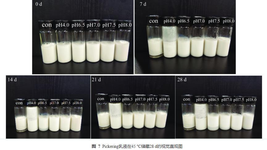 制備了不同pH下PPP-NP穩(wěn)定的水包油Pickering乳液,并在45℃下加速儲存28 d,每7 d進行拍照記錄其視覺外觀的變化。乳液的視覺外觀監(jiān)測照片如圖7所示。con和pH4.0的乳液在加速儲藏7 d后發(fā)生分層和聚結(jié)等現(xiàn)象;pH6.5的乳液在第14 d時底部出現(xiàn)分層現(xiàn)象;pH7.0~8.0的乳液在儲藏28 d后仍保持良好的視覺外觀,未出現(xiàn)相分離、聚結(jié)等現(xiàn)象,在整個實驗過程中均保持均勻穩(wěn)定。這些現(xiàn)象直觀地表明PPP-NP具有良好的乳化能力,且制備出的乳液具有較好的穩(wěn)定性,這可能與蛋白聚集體表面疏水性提高,從而有效降低其在油水界面上吸附所需的能量。