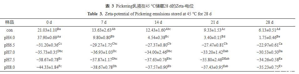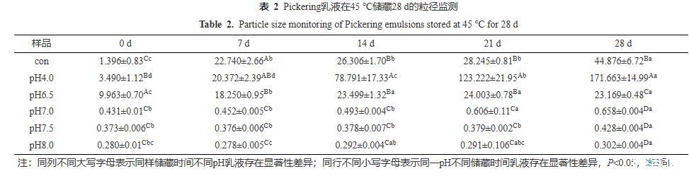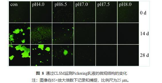 由圖8可知,當儲藏14 d時,Con、pH4.0的乳液均出現(xiàn)大面積的油滴聚集,pH6.5的乳液出現(xiàn)局部小聚集,而pH7.0~8.0的乳液微觀結(jié)構(gòu)顯示其分布仍然均勻,無任何油滴聚集現(xiàn)象。當儲藏28 d后,Con、pH4.0、pH6.5的乳液中聚集程度明顯加強,pH7.0的乳液也有較微弱的局部小聚集現(xiàn)象;而pH7.5與pH8.0的乳液仍保持良好的分布狀態(tài),這與圖7的視覺直觀圖、表2粒徑監(jiān)測和表3電位監(jiān)測的結(jié)果保持一致。CLSM的結(jié)果再次證實PPP-NP穩(wěn)定的乳液酸性條件下的長期穩(wěn)定性較差,在中性和堿性條件下有著更好的乳液穩(wěn)定性。這一結(jié)果與He等的結(jié)果相似,其所制備的樣品同樣在堿性條件下穩(wěn)定性更高。