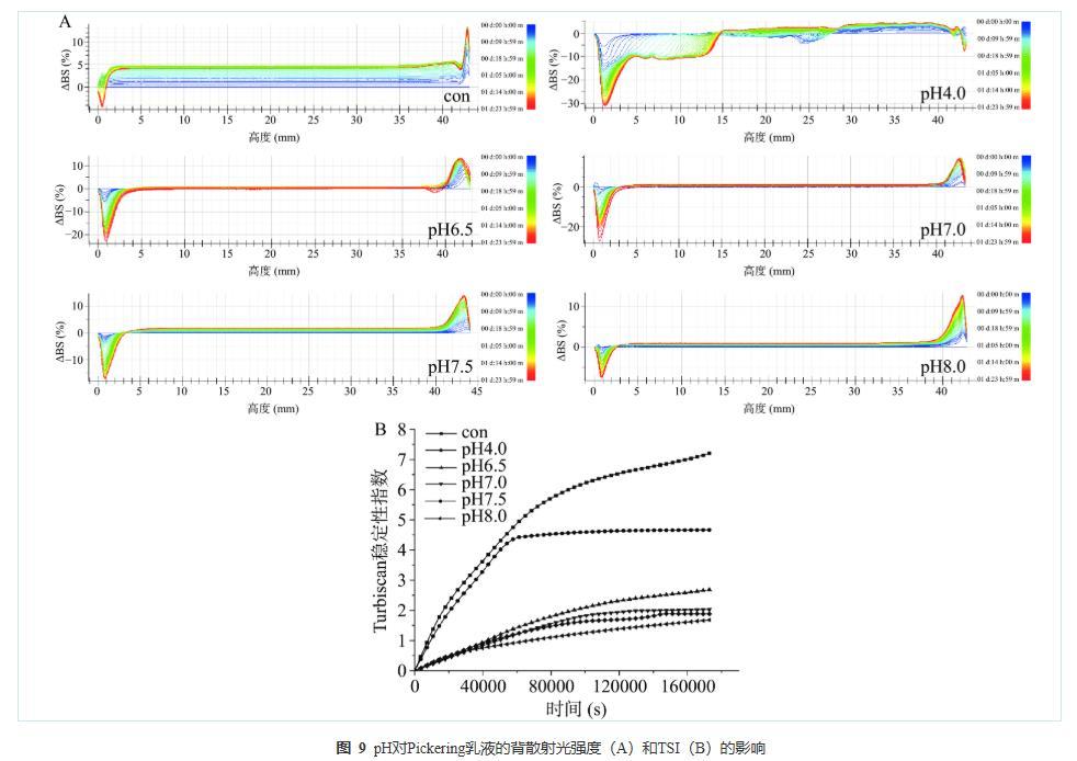雖然BS可以直觀反映乳液體系的局部不穩(wěn)定現(xiàn)象,但無法量化比較多個樣品的不穩(wěn)定程度。因此乳液穩(wěn)定性也可以使用TSI值來表征。TSI可以表征多種不穩(wěn)定現(xiàn)象對光強度變化的綜合影響,還可以比較出不同樣品間的穩(wěn)定性差異;TSI值越大,乳液體系越不穩(wěn)定。不同pH制備的PPP-NP穩(wěn)定的Pickering乳液的TSI如圖9B所示。所有樣品的TSI值均隨著掃描時間的增加而增大。從圖9B可以看出,乳液穩(wěn)定性結(jié)果為pH8.0>pH7.5>pH7.0>pH6.5>pH4.0>con。這與圖7的儲藏穩(wěn)定性直觀圖相一致。在瓶裝直觀圖中,肉眼僅方便觀察并記錄由乳液液滴上升引起的乳液分層,然而,在TSI測量中,TSI值不僅記錄了分層現(xiàn)象,而且還記錄了絮凝和聚結(jié)。絮凝和聚結(jié)被認為是乳液穩(wěn)定性中影響因素的一部分。因此TSI值的變化能更全面、系統(tǒng)的表征乳狀液體系的穩(wěn)定性。