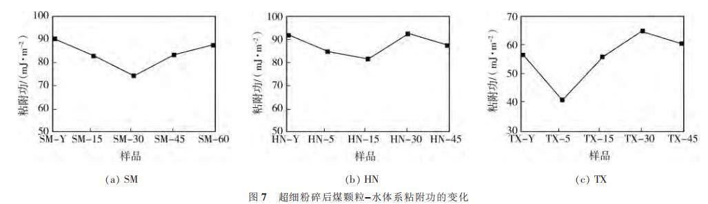 圖7超細粉碎后煤顆粒-水體系粘附功的變化
