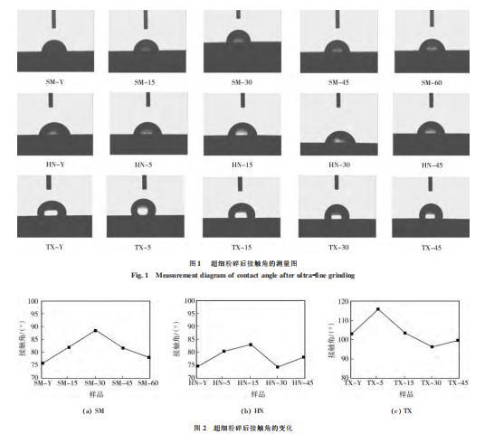 3種煤樣超細粉碎后的接觸角變化見圖1、2。可以看出,變質程度高的太西煤的接觸角在100°左右波動,明顯大于神木不粘煤和淮南氣煤的接觸角(在75°左右變化)。還可以看出,濕法超細粉碎后3種變質程度煤樣的接觸角的變化規律相似,在短時間的濕法超細粉碎后,接觸角變大,疏水性增強,隨著超細粉碎時間的延長,接觸角減小。總體來看,神木煤與淮南煤在濕法超細粉碎后的接觸角大于超細粉碎前的,說明對于低階煤,在濕法超細粉碎后,煤顆粒表面的疏水性在一定程度上有所增強,潤濕性減弱;太西煤在濕法粉磨30、45min后的接觸角小于超細粉碎前的,由此可得,對于高階煤,長時間進行濕法超細磨礦會劣化煤顆粒表面的疏水性。