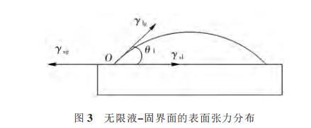 朱定一等通過設計一種在有限液-固界面上的潤濕性表征體系,推導出在無限液-固界面系統中固相表面張力和液-固界面張力的計算方法,并且通過潤濕角實驗和計算,證實了在接觸角較大時,該理論對固相表面張力的一致性。圖3所示為液相在無限固體平面上的潤濕表征系統。其中γsl、γlg、γsg分別表示固-液、液-氣、固-氣3個界面上的表面張力,O為氣-液-固三相接觸點,θ1為氣-液界面的切線與固-液界面的夾角,即接觸角。當達到平衡時,作用于潤濕周邊的3個表面張力在水平方向的分力必為0,此時的平衡狀態方程,即Young方程為