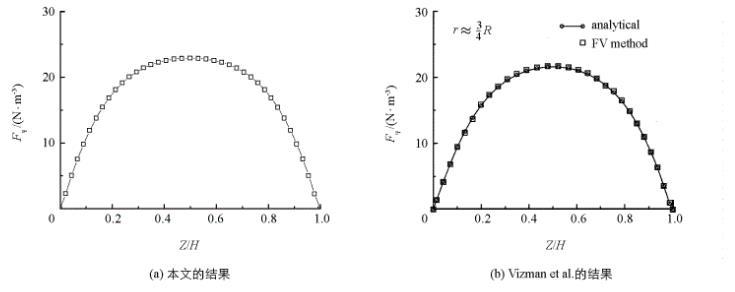 本文對液橋的三維網格進行了有效性驗證,最終采用60×68×60的非均勻計算網格。為了驗證計算程序的可靠性,本文對Vizman et al。文中的Rayleigh-Bénard結構的算例進行了重復。(采用導電的鎵熔體材料的相關參數為:密度ρ=6。1×10^3 kg/m^3,熱膨脹系數β=1。26×10^-4 /K,動力學粘度ν=1。907×10^-7 kg/ms,擴散系數κ_T=9。22×10^-6 kg/ms,電導率σ=3。87×10^6 A/Vm)。圖2為二極對非均勻旋轉磁場下,本文計算得到的熔體在r=3R/4處周向方向的洛倫茲力的分布曲線(a)和文獻結果(b)。由圖可知,熔體在r=3R/4處熔體周向的洛倫茲力呈拋物線型分布,并在z=0。5H處達到最大值。本文的計算結果與Vizman et al。的結果較好地吻合,且計算所得的周向洛倫茲力的最大值與Vizman et al。通過數值計算和實驗得到的最大值的相對誤差為1。8%。該結果驗證了本文計算程序的可靠性。