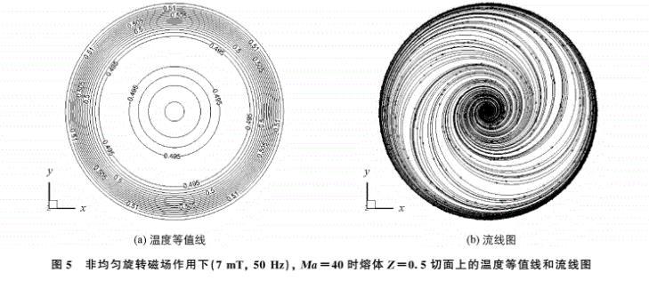 圖5 非均勻旋轉磁場作用下(7 mT, 50Hz), Ma=40時熔體Z=0。5H切面上的溫度等值線和流線圖