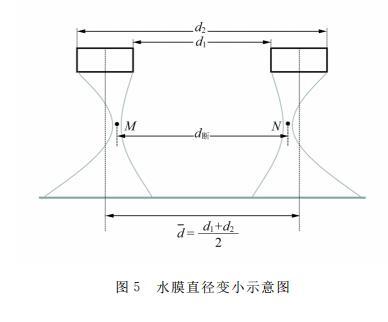 圖5給出了水膜直徑變小示意圖。吊環(huán)拉出的水膜,其內(nèi)表面、外表面都是雙曲面,但不對(duì)稱。一般而言,外表面的曲率半徑較小,而內(nèi)表面的曲率半徑較大,2個(gè)曲面頂點(diǎn)處的位置(圖5中M和N所示)將偏離吊環(huán)內(nèi)、外徑的平均值d?=(d1+d2)/2,如圖5中的豎直虛線所示。所以水膜斷裂處的直徑d斷,將小于吊環(huán)的d?,即d斷 < d?。由表2數(shù)據(jù)可以看出,隨著吊環(huán)直徑的減小,對(duì)應(yīng)水膜的內(nèi)、外曲面的不對(duì)稱程度增加,斷裂處水膜直徑的收縮程度("頸縮")增大,所以2個(gè)直徑的比值d斷/d?變小。