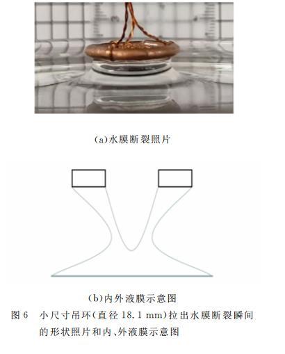 另一方面,對(duì)于尺寸較小的吊環(huán),如圖6所示,水膜的內(nèi)表面將連接在一起,只有外表面的表面張力起作用,但在計(jì)算公式中,仍以2πd?代入式(5)中,所以表面張力系數(shù)的計(jì)算值偏小。標(biāo)準(zhǔn)環(huán)的尺寸適中,環(huán)壁很薄,所以圖1(c)與圖1(d)水膜形狀近似相同,實(shí)際測(cè)量的F等于U斷前,因此計(jì)算得到的α2誤差很小。可見,選用水膜斷裂點(diǎn)計(jì)算的表面張力系數(shù)的影響因素很多,實(shí)際斷裂點(diǎn)的瞬間位置、吊環(huán)尺寸、吊環(huán)厚薄等都是需要考慮的因素。