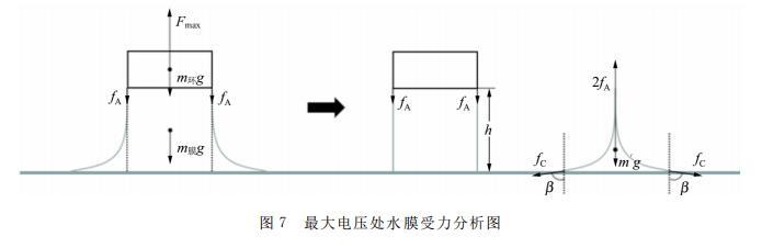 采用隔離法,對(duì)電壓最大值處的水膜進(jìn)行受力分析。圖7中虛線將水膜分成2部分,吊環(huán)正下方的水膜由于水分子相互吸引力附加在拉力Fmax中,而另一部分水膜的重力m′g,與2fA以及水膜與液面處的表面張力2fCcosβ,三者形成平衡狀態(tài),即受力分析與水膜斷裂時(shí)[圖1(d)]m2的受力相似。所以計(jì)算水膜的重力僅僅需要考慮吊環(huán)正下方的重力即可。另外,電壓最大值處的水膜穩(wěn)定性最好,拉升高度h容易測(cè)量。對(duì)于尺寸較小的吊環(huán)(πd?=78.2 mm),電壓最大值處,水膜的內(nèi)表面沒有連接在一起,仍然與液體表面接觸良好,所以測(cè)量的誤差也較小(Eα1=3.9%)。但是對(duì)于特別小的吊環(huán)(πd?=57.4 mm),水膜的內(nèi)表面連接在一起,其表面張力系數(shù)明顯偏小。