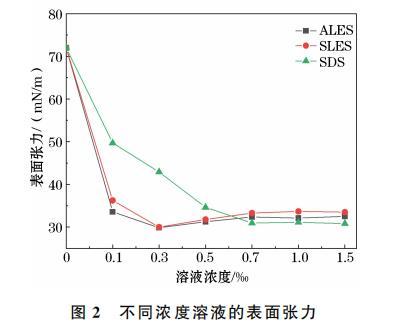 選取十二烷基聚氧乙烯醚硫酸銨(ALES)、十二烷基聚氧乙烯醚硫酸鈉(SLES)和十二烷基硫酸鈉(SDS)3種表面活性劑,進(jìn)行表面張力的測(cè)試。測(cè)試過(guò)程中,通過(guò)調(diào)節(jié)芬蘭Kibron公司生產(chǎn)的Delta-8全自動(dòng)高通量表面張力儀將鉑環(huán)緩慢浸入溶液中,然后緩慢提起鉑環(huán),當(dāng)鉑環(huán)與液體樣品分離時(shí)進(jìn)行測(cè)量,并記錄表面張力,每種溶液測(cè)量3次。每次測(cè)量前,用無(wú)離子水(IFW)清洗鉑環(huán)并在酒精燈上干燥。