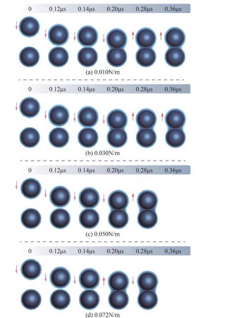 針對表面液膜厚度為0.15Rp、碰撞初速度為10m/s、表面張力系數為0.01~0.072N/m的濕顆粒碰撞過程進行了詳細的數值模擬。如圖5所示,不同表面張力系數影響了液橋形態的演化規律。在0.14μs時,具有不同表面張力的濕顆粒同時接觸液膜,隨后在液體分子相互作用力的推動下,液膜流動迅速并填充進顆粒間的間隙,形成穩定的液橋。碰撞后,顆粒1反彈向上,拉伸液橋使其變高變細,最終顆粒上升到最高點時,動能被完全消耗,被液橋重新拉回液膜表面,實現兩顆粒的聚并。當表面張力系數為0.01N/m時,顆粒向上反彈的高度更加明顯,回落后與下方顆粒再次碰觸反彈,最終在0.46μs時聚并。隨著表面張力的增加,顆粒反彈時的速度衰減更快,液橋更快地將其拉回液膜表面。