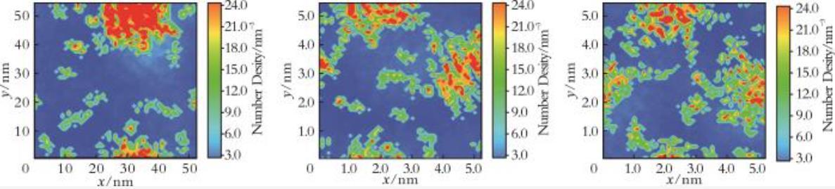 對界面微觀結構與形貌的可視化分析(包括軌跡快照、二維密度俯視圖)可提供分子構象、排列及聚集狀態的直觀圖像,輔以界面漲落分析及團簇分析,可有效探測界面在橫向(x?y平面)的均質性、微相分離現象(如氟碳/氫碳富集區)、微小聚集體(如半膠束)的形成以及界面粗糙度。圖6為x?y平面內表面活性劑分子的二維數密度分布圖。